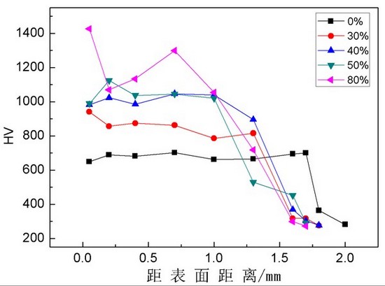 我司開(kāi)發(fā)的新型復(fù)合粉末為鐵基粉末及具有超高硬度的第二相所構(gòu)成,第二相最高硬度可達(dá)到HV2600-3200,因此,該硬質(zhì)相的加入可大大提升熔覆層的整體硬度。同時(shí),經(jīng)過(guò)對(duì)不同比例粉末進(jìn)行多次反復(fù)的試驗(yàn)研究,發(fā)現(xiàn)復(fù)合粉末在一定比例時(shí)得到的超高耐磨合金層可同時(shí)滿(mǎn)足高硬度及結(jié)合面高韌性?xún)纱髢?yōu)勢(shì),整體性能最佳。對(duì)熔覆層進(jìn)行微觀(guān)分析,發(fā)現(xiàn)其中的硬質(zhì)相比例達(dá)到了70%,耐磨層的平均硬度為HRC64以上,遠(yuǎn)遠(yuǎn)高于基材的硬度,真正做到了內(nèi)里強(qiáng)韌外表超耐磨。