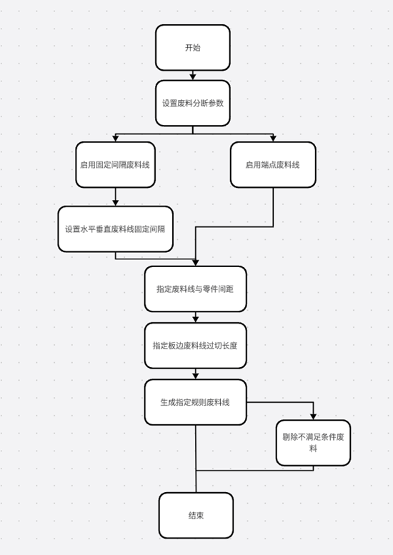華工激光自主研發(fā)的HGNEST將廢料線定義為兩類,一類是在板材上以固定間隔的形式貫穿整張板材而設(shè)定的廢料線,稱之為定長廢料線,另一類是從零件端點出發(fā)向周圍發(fā)散從而構(gòu)成的廢料線,稱之為端點廢料線,根據(jù)不同的應(yīng)用場景,可選擇不同的廢料線,一般定長廢料線設(shè)置的間隔為板材尺寸的十分之一。