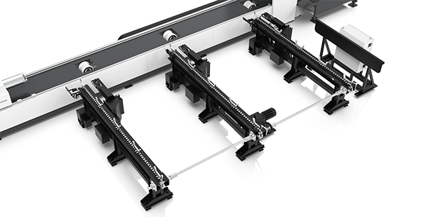 床身安裝有托舉裝置,當(dāng)需要托舉管材時(shí)相應(yīng)的托舉架會(huì)升起,當(dāng)X軸移動(dòng)時(shí)靠近X軸的相應(yīng)托舉架會(huì)自動(dòng)落下,以避免干涉。